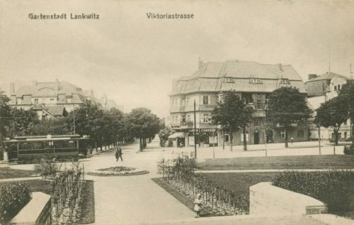 Platz vor der Dreifaltigkeitskirche. Die Straßenbahn der Linie 99 (sie fuhr 1900-1902 als Pferdebahn) fährt rechts in die Schulstraße - ab 1930 geradeaus Kaiser-Wilhelm-Straße entlang - nach Tempelhof.