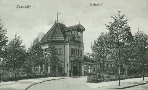 Bahnhof Lankwitz mit Blick von der Kaulbachstraße aus. Der Bahnhof und Damm sind 1899 errichtet worden. Das Empfangsgebäude wurde bei dem Bombenangriff in der Nacht vom 23./24. August 1943 zerstört, der Vorplatz ist heute noch vorhanden.