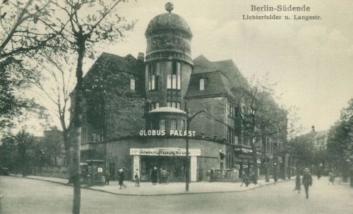 Links die heutige Liebenowzeile, rechts die heutige Borstellstraße; das Kino wurde 1943 zerstört.